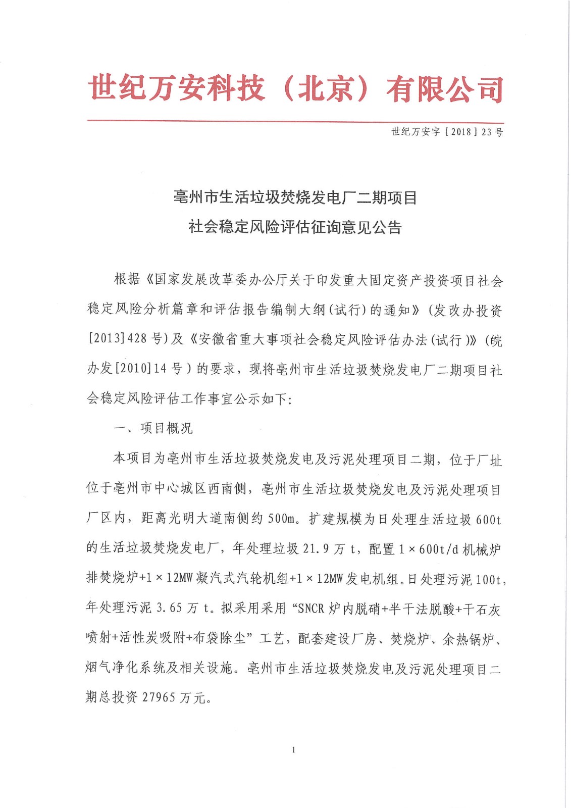 亳州市生活垃圾發(fā)電廠社會(huì)穩(wěn)定評(píng)估征詢意見公告