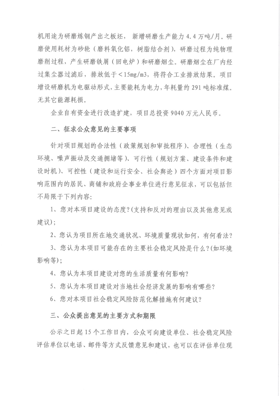 福建福欣特殊鋼有限公司連鑄研磨機增設項目 社會穩(wěn)定風險評估征詢意見公告