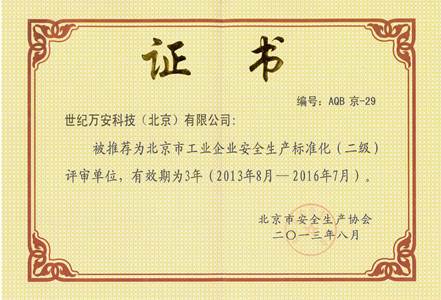 北京市安全生產(chǎn)協(xié)會于8月向我公司頒發(fā)了北京市工業(yè)企業(yè)安全生產(chǎn)標(biāo)準(zhǔn)化(二級)評審單位的證書,有效期為3年(2013年8月-2016年7月)。